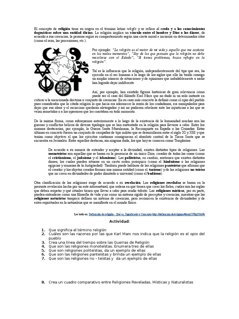 La religión es un sistema de creencias, costumbres y símbolos establecidos en torno a una idea de la.. Un ser divino crea y controla el mundo, por lo tanto el individuo gana. Concepto y significado de religión: El concepto de un mundo en el más allá es percibir en unas bases personales y con relación a un dios/es. La existencia del mundo y del ser humano se plantea como parte de un plan con un propósito. De acuerdo a sus creencias, la persona regirá su comportamiento según una cierta moral e incurrirá en determinados ritos (como el rezo, las procesiones, etc.). La religión implica un vínculo entre el hombre y dios o los dioses ;. La existencia del mundo y del ser humano se plantea como parte de un plan con un propósito.